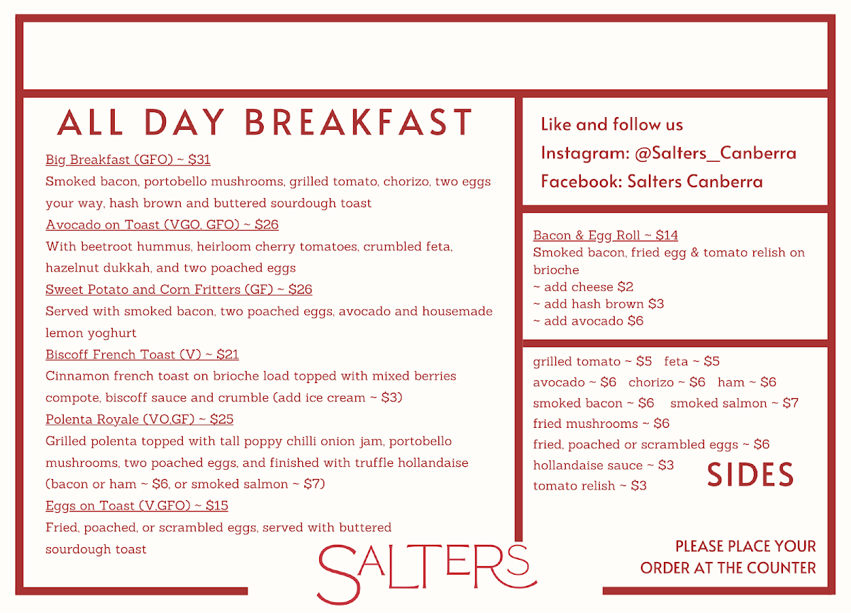 Salters Canberra offers a diverse menu that caters to a range of tastes and preferences, showcasing the best of modern café cuisine. Start your day with their signature Big Breakfast, a hearty plate that promises satisfaction. If you prefer something a bit lighter, the Avocado on Toast is a staple, beautifully presented with fresh ingredients. For those with a sweet tooth, you can't go wrong with the Biscoff French Toast or Sweet Potato and Corn Fritters, both of which burst with flavor and creativity.